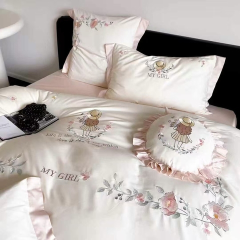 Juego de cama de algodón puro 100% de cuatro piezas para primavera y otoño, Sábana plana con funda de almohada de encaje bordado con patrón de plantas